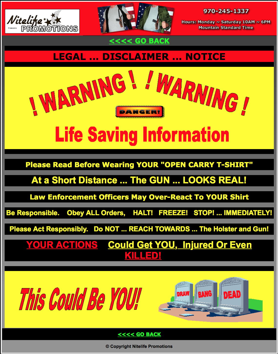 Liebe is concerned that those who wear his shirts could put themselves in danger of a confrontation with law enforcement. So, to cover his butt from any potential legal liability, the shirts come with the following warning: